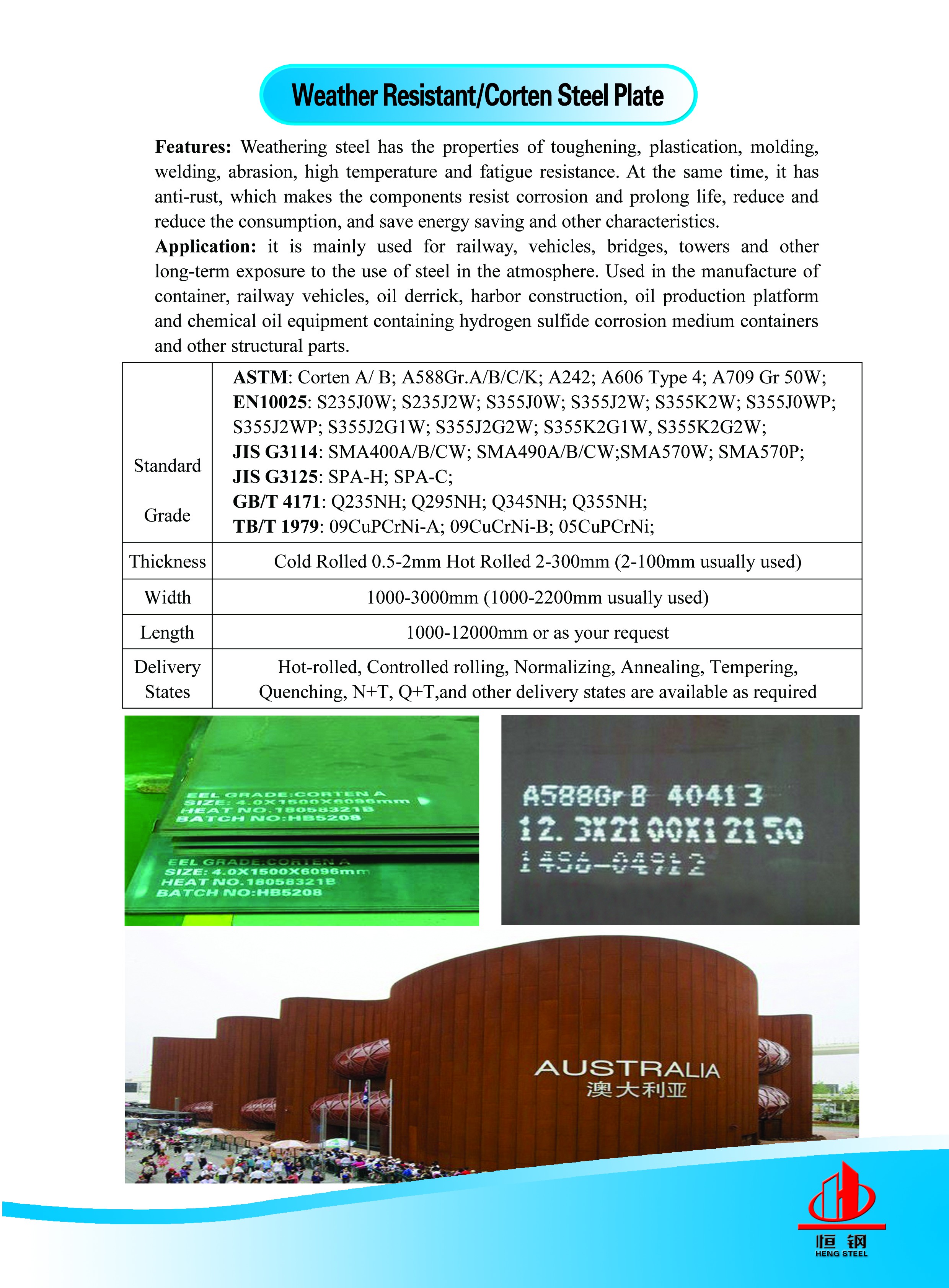 (1)Material:Cortan A B,ASTM A588,ASTM A242,S355J2WP, S355J0WP, SPA-H ,Q345NH, Q355NH (2) Delivery Condition:CR,HR,Normalizing, Annealing,Tempering,Q+T,N+T (3) Surface Treatment:Shotblast sandblasting paint