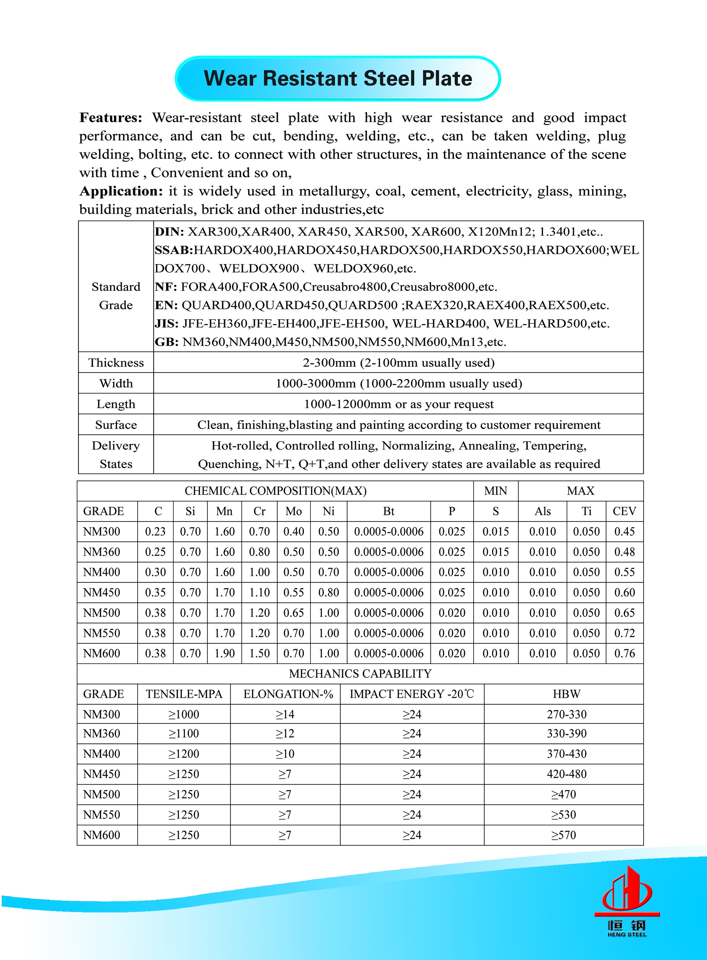 (1)Material:NM360 400 500 600,Hardox400 450 500 600 700,AR400 500 600,Weldox600 700,Mn13,X120Mn12 (2)Delivery Condition: HR,Normalizing, Annealing,Tempering,Q+T,N+T (3) Surface Treatment:Shotblast sandblasting paint